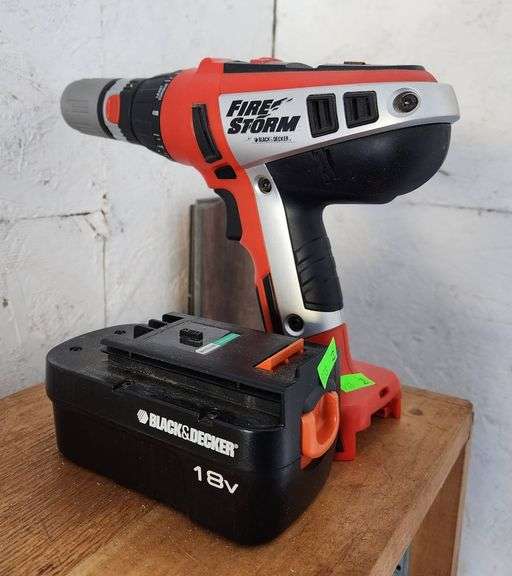 Firestorm cordless drill, model FS1800D, Black & Decker brand. Includes 18V battery pack and charger port. Shows signs of prior use.Charger not included.