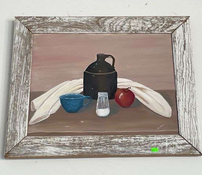 Oil-on-board still life painting depicting a jug, blue cup, small jar, and apple against a neutral backdrop. Signed by the artist in the lower right corner. Displayed in a distressed white frame. Minor wear visible on the frame.