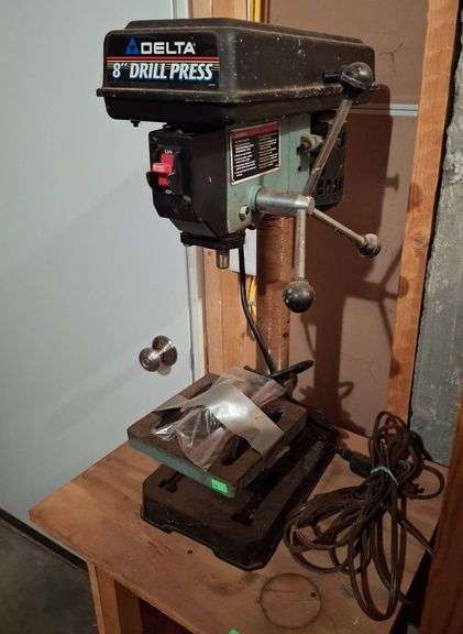Delta 8-in. drill press with power cord, mounted on a custom-built plywood stand. Includes visible clamping accessory on the drill press base. Stand features open sides and a flat top.