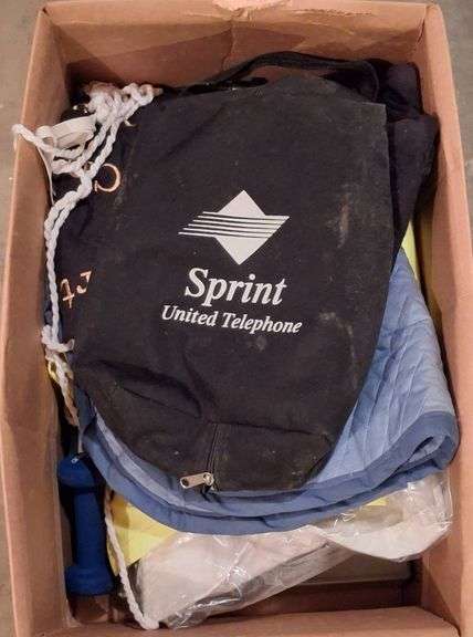 Box with Sprint-branded drawstring bag, quilted covers, papers, a dumbbell, and other items. Condition varies.