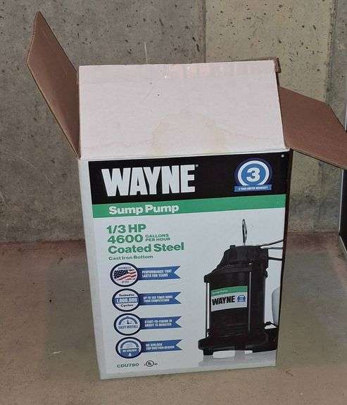 Wayne sump pump with 1/3 HP motor, capable of handling up to 4600 gallons per hour. Includes coated steel construction and float switch. Used condition with visible wear on the unit. Packaged with power cord. No additional accessories included.