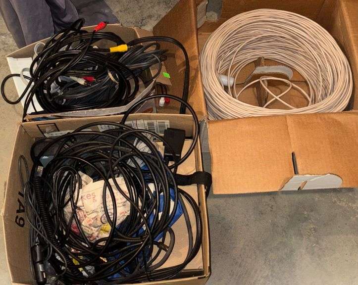 Cables and wires, including AV cables, HDMI cords, power adapters, and a roll of white cable.