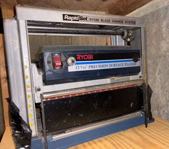 Ryobi 12-inch AP-12 planer with 115V AC motor, 14A, 60Hz, and 8000 RPM. Features a Precision Surface Plate and RapidSet blade change system. Moderate signs of use visible. Power cord included.