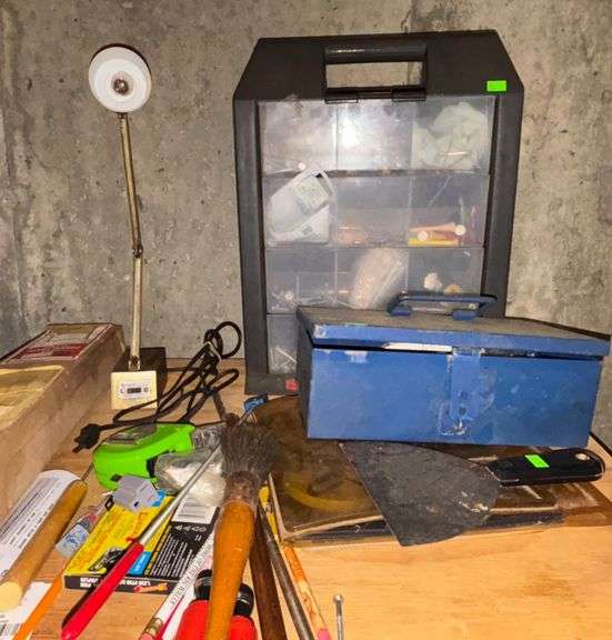Assortment including a desk lamp with wooden base, metal toolbox with contents, organizer with small hardware, and a Sears Craftsman Four Square Frame Clamp in original box. Other miscellaneous hand tools and supplies are included.