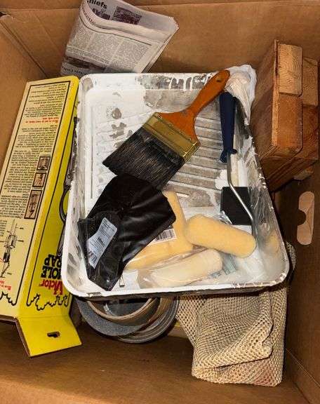 Includes a paint tray, brushes, paint rollers, plastic roof cement in a 1-gallon can, a Victor mole trap in original box, and wood spools, among other utility tools and materials. Items show signs of use.