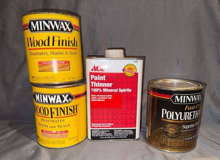 Includes various brands such as Minwax, Ace Denatured Alcohol, Titebond glue, Zinsser primer, paint brushes, rollers, and multiple cans of wood finish, polyurethane, and paint thinner.