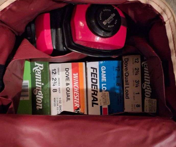 Red shooting bag embroidered with '1988 Grand American,' featuring zippered compartments and an adjustable strap. Contains a mix of ammunition, including 12-gauge Remington, Winchester, and Federal Dove & Quail Game Load shotshells.
