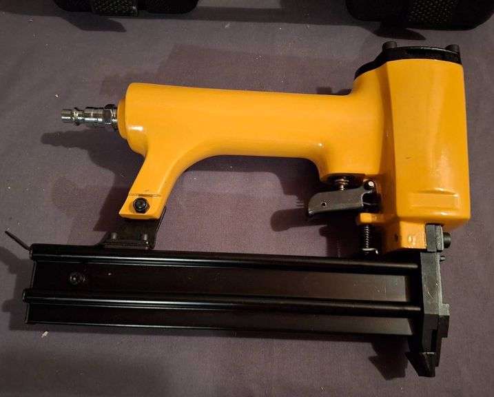 Magnum air brad nailer operating at 60-95 PSI with a durable plastic case. Includes manual and nail strips. Designed with a 1/4 in. air hose fitting.