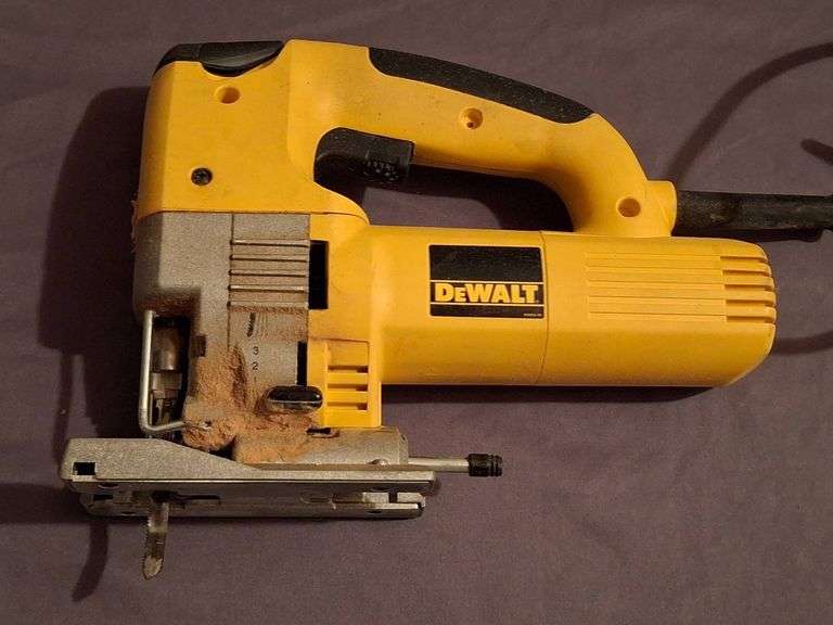 DeWALT DW321 variable speed jigsaw with metal baseplate and power cord. Includes branded hard case and instruction sheet. Made in Italy. 120V, 5.8A, and 500-3100 rpm. Shows signs of use, including wood debris.