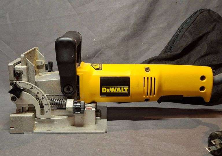 DeWalt DW682 plate joiner with 6.5A, 120V AC/DC motor. Includes hard plastic case, dust bag, and additional accessories. Features adjustable fence and precision cutting capabilities.