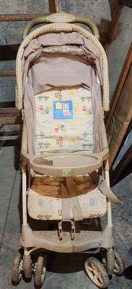 Kolcraft stroller from 2005 licensed by Sesame Workshop. Printed fabric features colorful designs. Includes canopy, safety harness, and four double wheels. Shows signs of wear from use.