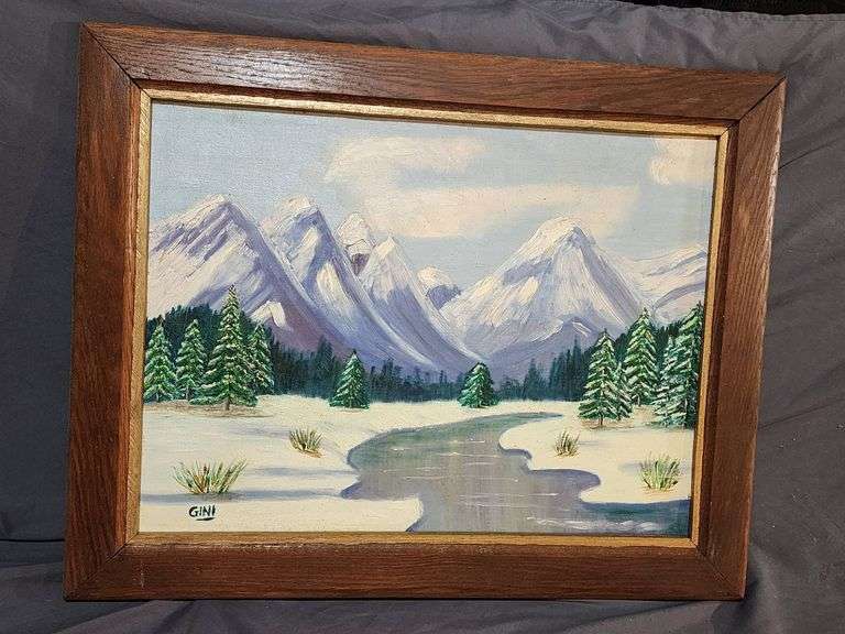 29″x23″ oil painting on board, “The Shinning Mountains,” signed ‘GINI’ on front. Dated Feb-1983 on back. Features snow-covered mountains, trees, and a river. Framed in brown wood.