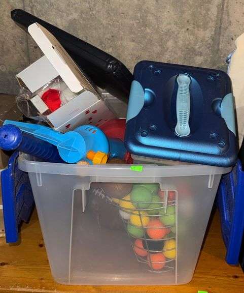 A plastic bin with a Mr. Potato Head toy, a metal basket of multi-colored golf balls, 3 18” Louisville Slugger mini baseball bats, and a Manchester Squires folding seat cushion. Items appear in used condition.