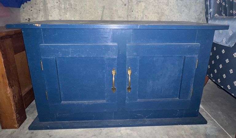 Blue painted cabinet with dual swing doors and brass handles. Interior features an unfinished wood finish. Overall dimensions are 39”x19”x22”.