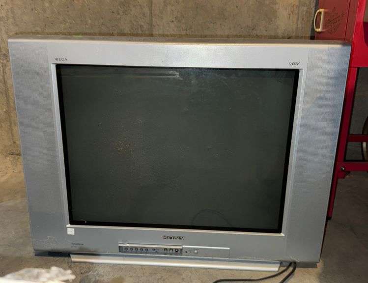 Sony Trinitron CRT television, 27-inch screen. Features AV inputs, control panel, and rear connectivity ports. Model details visible on the back panel. Power cord included; condition consistent with use.