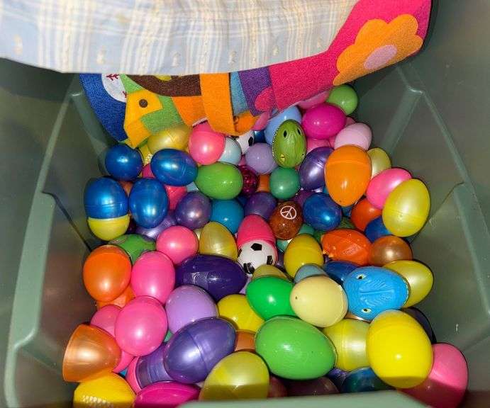 Collection Inc. a 27” fabric rabbit with a plaid dress, 4 patterned plastic buckets, 6 fabric baskets and numerous colorful plastic Easter eggs. Buckets feature floral designs.