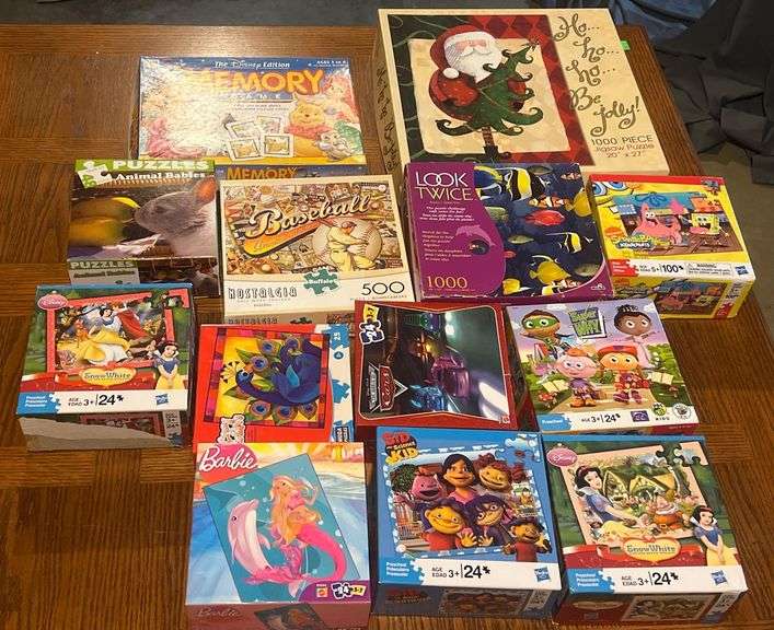 Themed puzzles, ranging from 24 to 1000 pieces. Popular characters inc. Barbie, Disney, and SpongeBob SquarePants. Includes puzzles of varying themes like animals, cars, and holiday designs. Lot contains multiple box sizes. Condition appears consistent with unopened packaging.