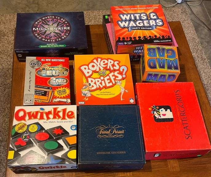 Includes 10 games such as Scattergories, Mad Gab, Wits & Wagers, and Trivial Pursuit. Largest box measures 11” x 13.5”, smallest 6.5” x 6.5”. Box conditions show varying degrees of wear from use.