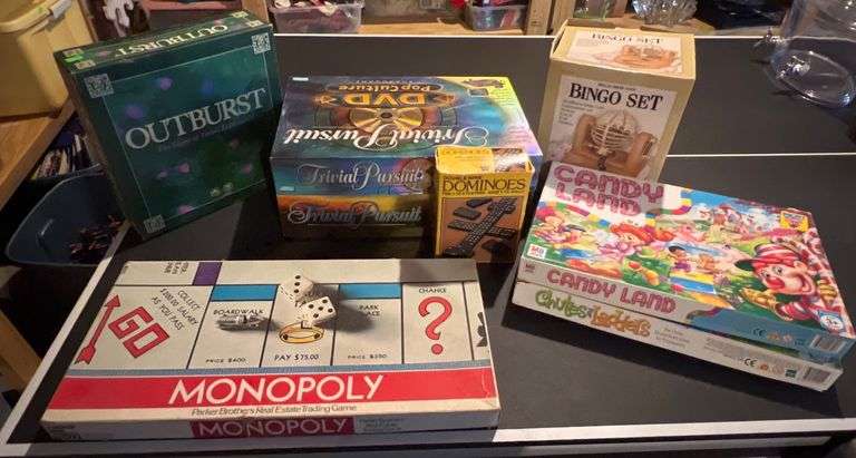 Games Inc. Monopoly, Trivial Pursuit, Candy Land, Outburst, and Bingo. Includes card- and tile-based games such as Dominoes.