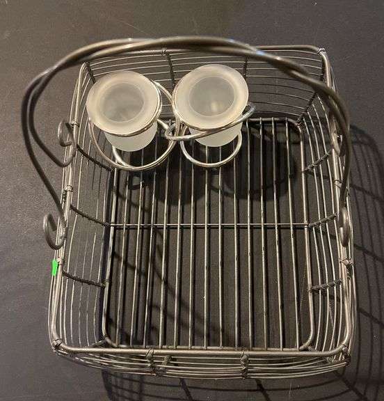 Metal wire basket measuring 11” x 11.5” with handle and 2 frosted glass candle holders, each approximately 3” x 3.5”. The basket features an open grid design with a curved handle.
