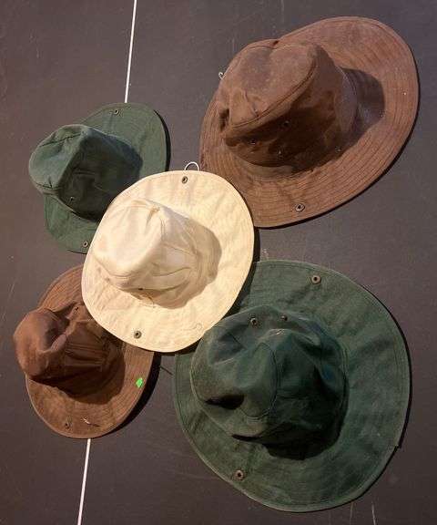 5 outdoor-style wide-brim hats in green, brown, and beige colors with adjustable drawstrings and brass snaps. Inner linings are mesh for breathability. Minor wear visible.