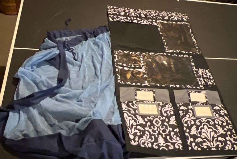 Includes a fabric organizer with multiple patterned pockets (22” x 40.5”) and a mesh drawstring bag (20.5” x 30”). The organizer features a black backing with additional clear and patterned fabric pockets. Both items feature functional designs and are in good overall condition.