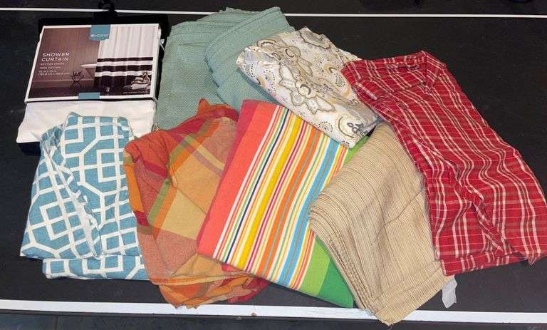 A fabric assortment featuring a variety of patterns and materials. Includes 2 new shower curtains, along with several loose fabric pieces in plaid, stripe, and solid designs.