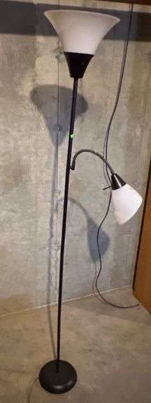 Black metal floor lamp with a top torchiere shade and an adjustable side-arm shade, both in white glass. Features a circular base for stability and corded electric power source. Minor wear consistent with use.