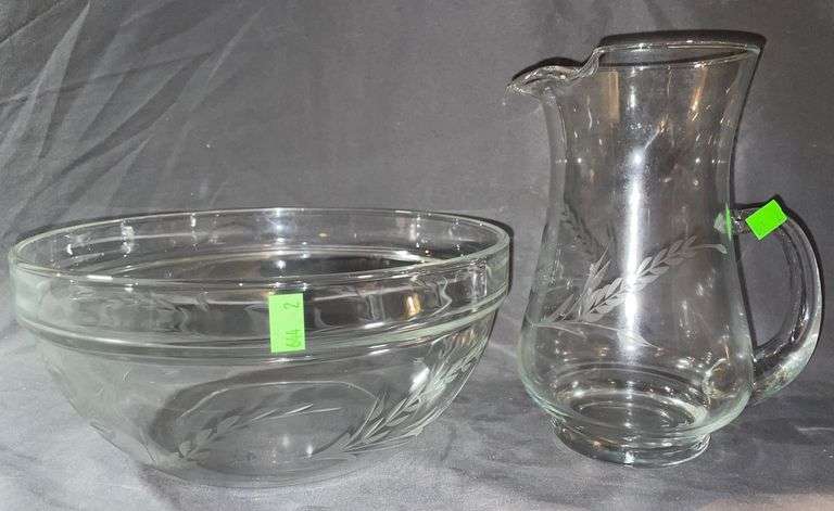 Clear glass pitcher and bowl featuring an etched floral motif. The pitcher stands approx. 7.5 in. tall, while the bowl has a diameter of approx. 9 in. Both items include handles and an etched decorative pattern.