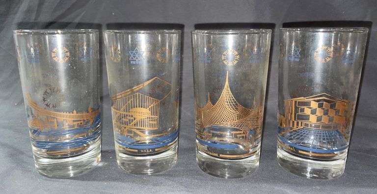 4 glass tumblers featuring Expo 67 Montreal Canada designs with gold accents. Includes imagery such as architectural landmarks and Expo 67 logo. Each glass measures approx. 5 in. tall.