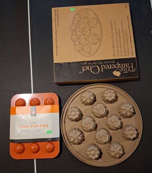 Pampered Chef Silicone Floral Cupcake Pan (model 1613) with original box and a nonstick cake pop pan.