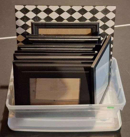 8 picture frames in black finishes, 1 with a checkered pattern. Includes various sizes and styles, some with inserts for photos or artwork. Suitable for wall or tabletop display.