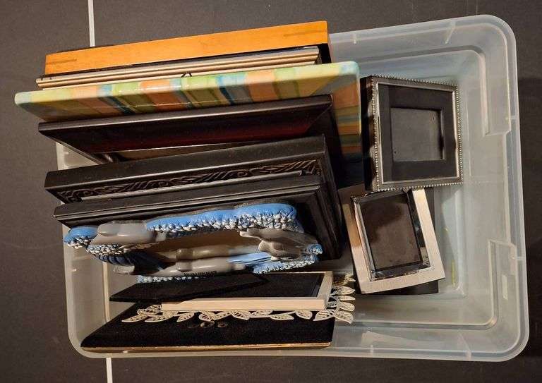 10 frames Inc. metal frames with decorative accents, plastic styles, and painted designs. Includes various sizes and motifs such as dolphins, leaves, and stripes.