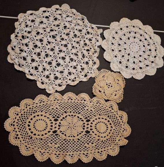 Various crochet and lace textiles in cream and beige tones, featuring oval and round designs. Stored in a plastic crate. Condition consistent with prior use.