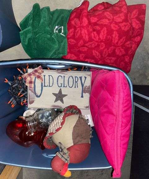 Lot contains 4 glass vases in assorted colors and styles, a boxed set of 4 photo coasters with holiday lights motif, a 'Old Glory' hanging sign with distressed finish and star detail, orange string lights, and soft textile decor items including a fabric bird figure and colored fabric pieces.