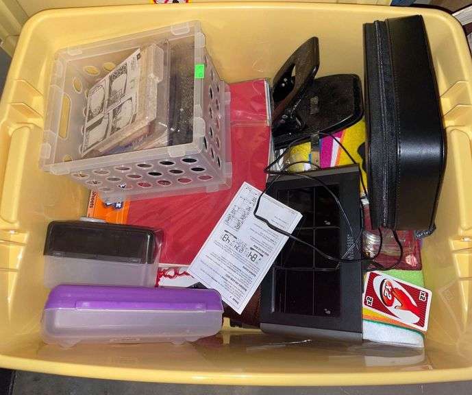 Includes a shoe polish kit with brushes and polish, plastic storage bins, foam paintbrushes with tracing paper, a deck of playing cards, and various household and craft supplies.