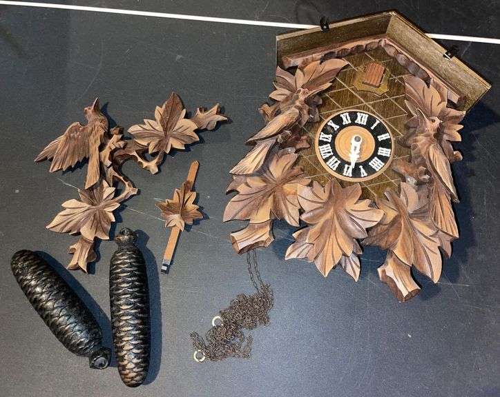 Carved cuckoo clock featuring leaf and bird designs, measuring 12.5”x10”x5.5”. Includes weights, chains, and pendulum.