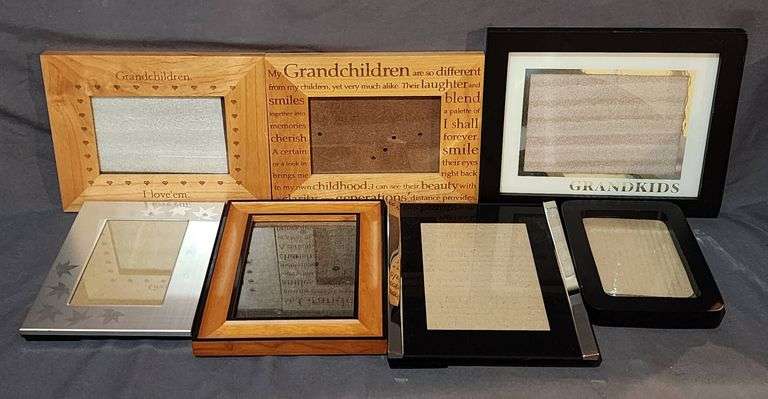 7 picture frames ranging 7"-9". Includes glass, wood, and metal materials. Features a variety of designs, including engraved text and decorative accents. Some frames include easel backs.