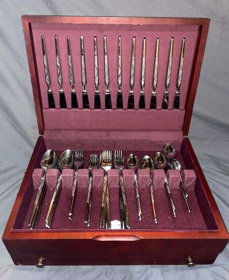 41 pieces of stainless steel flatware by Wm. Rogers, Japan, stored in an anti-tarnish case. Includes knives, forks, spoons, and teaspoons with floral patterned handles.