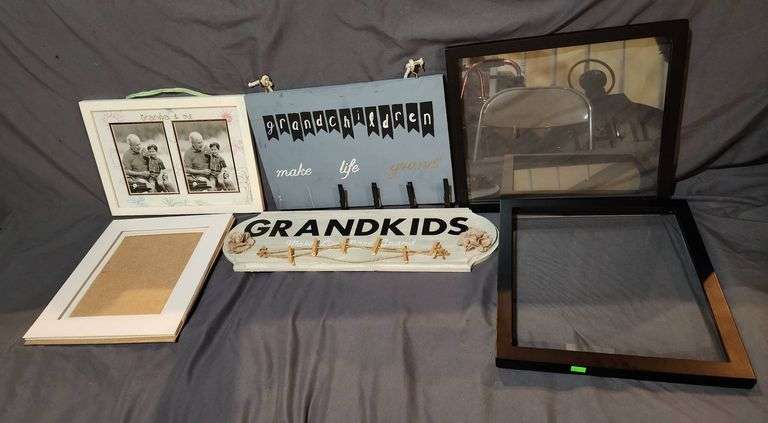 Group including frames with family-oriented imagery, wall plaques featuring hooks and family-themed texts. Measurements range 7"-12". Includes both hanging and tabletop display options.