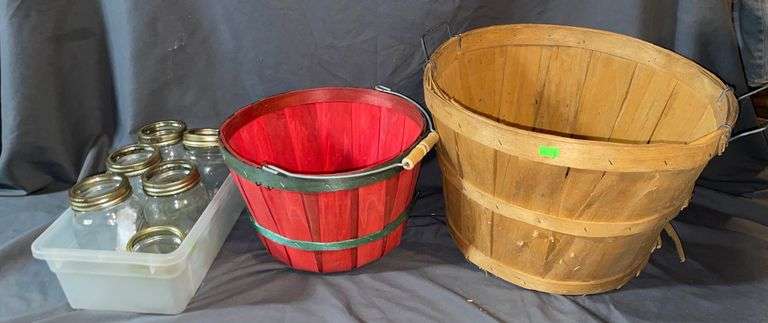 Includes 2 round produce baskets (15”-11” dia.) with metal bands and wooden handles, plus 5 glass mason jars with lids stored in a transparent plastic bin.