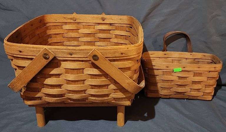 Two Longaberger baskets featuring handwoven designs, one measuring approx. 7″ with a wooden stand, the other approx. 3″ with a handle. Marked with Longaberger branding and date inscriptions.