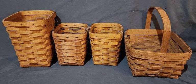 4 Longaberger baskets with handwoven construction, signed and dated from 1991-1993. Made in Dresden, Ohio, USA. Heights range from 5"-9". Includes 1 basket with a handle.