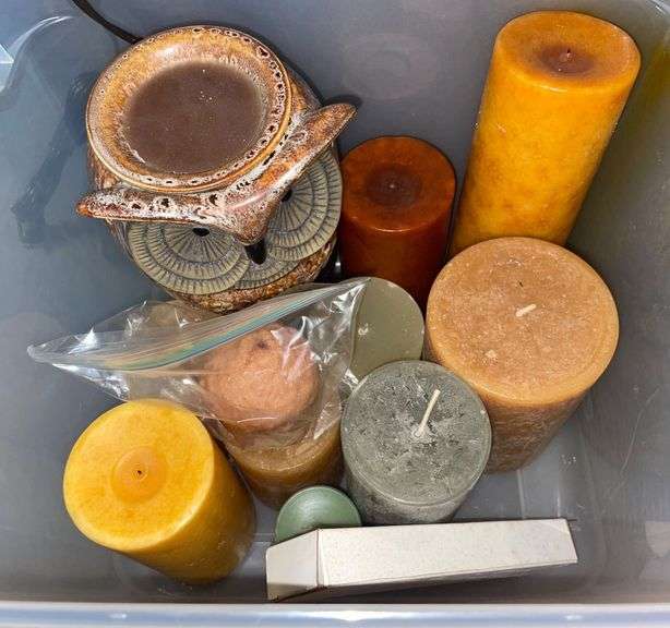 Includes a ceramic owl-shaped electric wax warmer by Rimports Inc. (model SC-286) and a variety of candles, including cylindrical pillar candles, a boxed candle, and a WoodWick candle. Items are contained in a clear plastic storage bin with a lid.