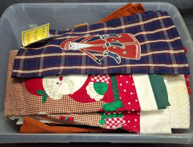 Textiles Inc. embroidered Christmas motifs, nautical themes, and plaid patterns. Items include kitchen and hand towels stored in a plastic bin. Minor wear visible on some pieces.