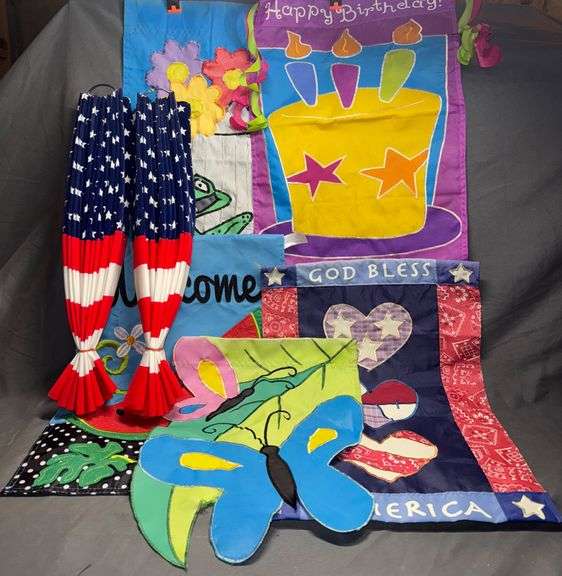 Includes 1 Happy Birthday flag, 1 patriotic flag with hearts motif, 1 Welcome flag with watermelon design, 1 watering can flag with frog and flowers motif, 1 butterfly flag, and 2 American flag-themed windsocks.