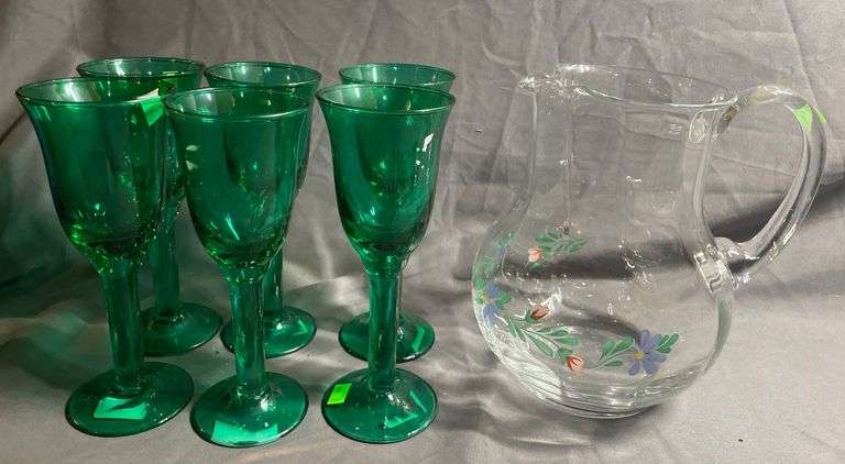 6 green glass goblets approx. 7 in. tall and a clear glass pitcher with painted floral designs. Goblets show minor wear at bases; pitcher is intact with applied handle.