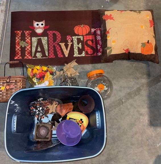 Includes a fabric harvest banner, fall-themed pillow, pumpkin-shaped jar, basket, and various autumn decorations in a storage bin. Items display mixed materials such as fabric, wicker, and glass.