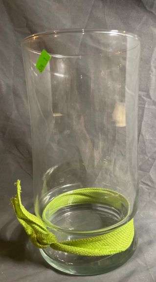 LOT 574 - Clear Glass Cylindrical Vase with Green Fabric Accent 5.5”x10.5”