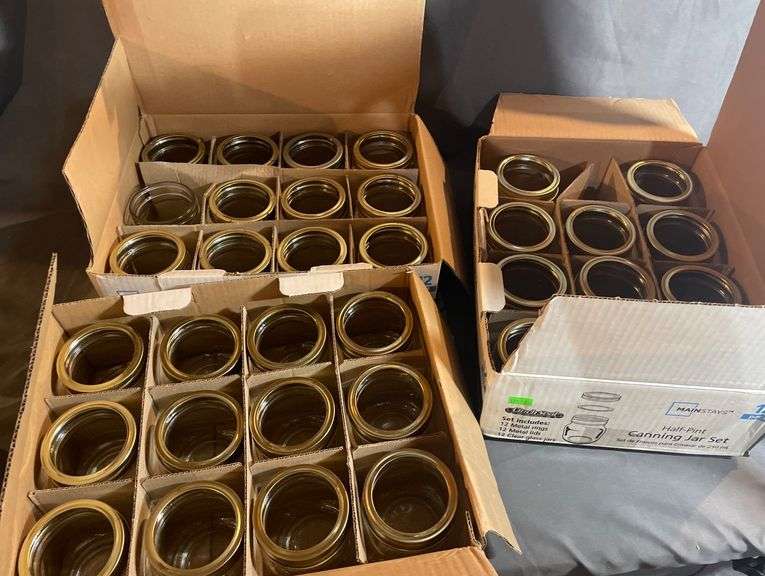 36 Ball half-pint glass canning jars with gold-tone lids in original packaging. Includes 3 boxes, each containing 12 jars with lids. Condition appears unused, with boxes opened for inspection.